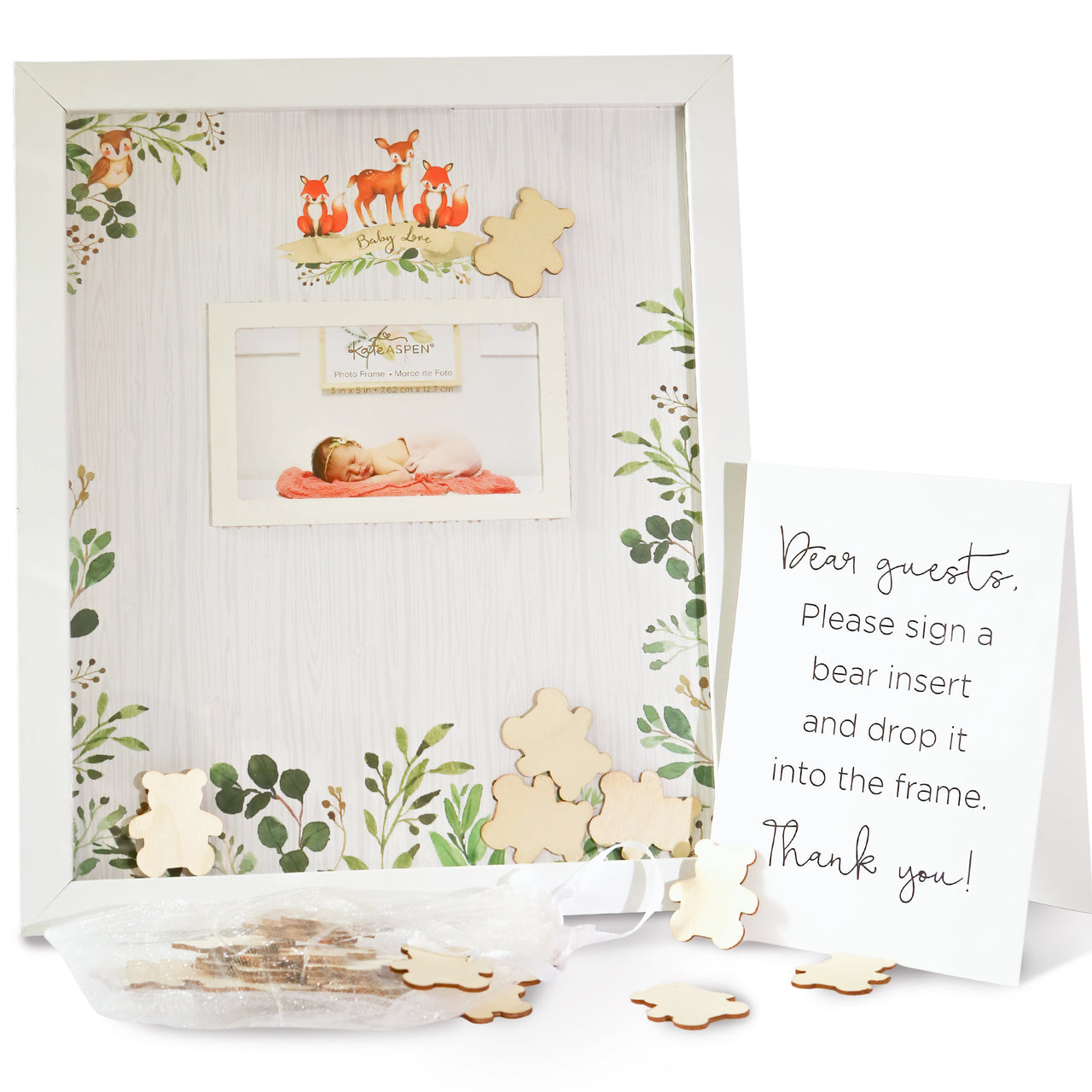 Details: White Woodland Baby guest book has a woodgrain pattern background, with greenery along the border, and an arrangement of animals in the top middle with a "Baby Love" banner. The inner frame holds a personal photo. Pre-printed tent card reads "Dear guests, Please sign a bear insert and drop it into the frame. Thank you!". Set includes 1 MDF shadowbox frame, 1 cardstock tent card, and 30 wooden bear inserts in an organza bag.