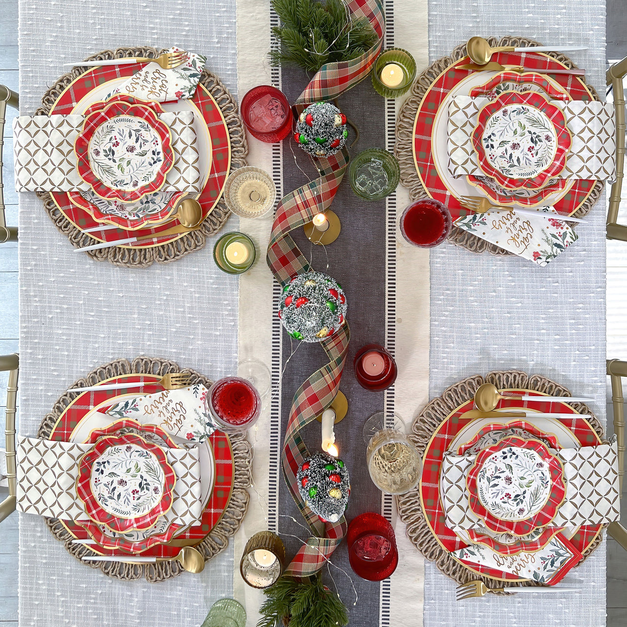 Kate Aspen's new Disposable Christmas Tableware Set includes 7” Plate (set of 16), 9” Plate (set of 16), and Napkin (set of 30). Kate Aspen's 2024 Christmas design is stylish and classic at the same time with rich greens and reds, Christmas florals, and foliage. The 7-inch plates are perfect for appetizers or desserts, these plates feature a festive design of scattered foliage and berries with scalloped edges and gold foil adding a cheerful touch to any holiday gathering. The 9-inch plates are great for main courses. The 9-inch plates match the smaller plates with a pretty Christmas tree, flowers, and berries. These decorative paper plates are strong and will last through holiday meals. The paper napkins are soft yet thick, and absorbent. They also match the paper plates, making your table look beautiful for your guests. This set is both useful and stylish, creating a cheerful and festive feel for your Christmas celebrations, and making it easy to host family and friends. Pair these with the Kate Aspen Christmas 13” Charger Plate Placemats for a coordinated Christmas look!